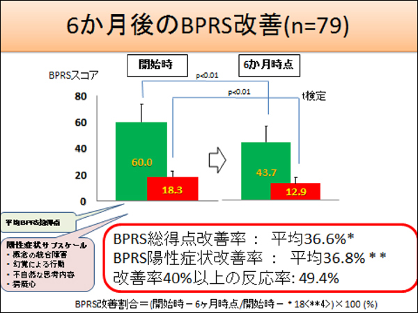 当センターでは平成22年1月から平成27年8月までに120名以上の患者さんでクロザピンを使用してきました。実際の精神症状の改善率についてのデータです。